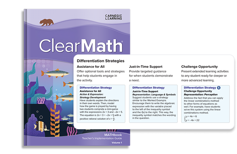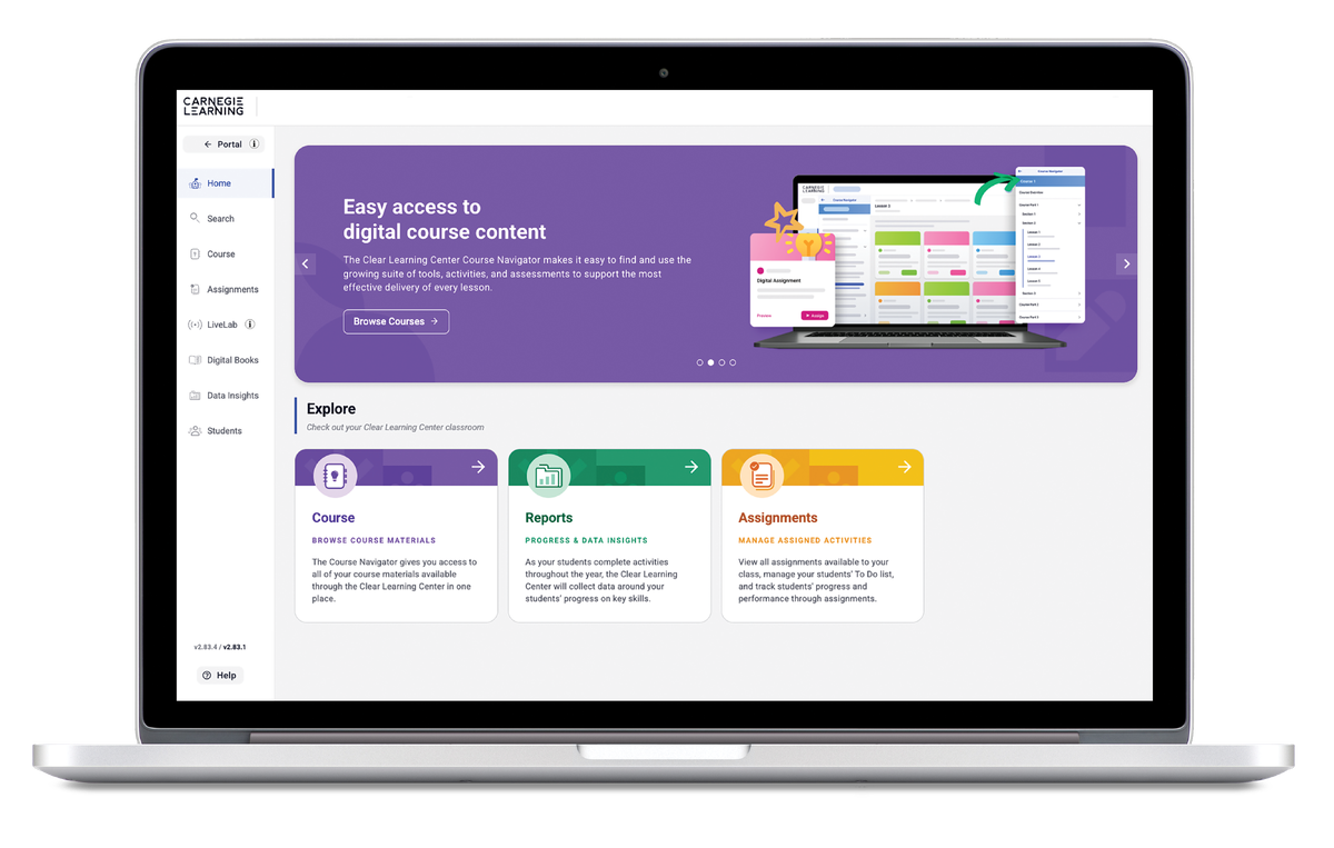 클리어매스 G6~G12는 미국과 캐나다 중고등학교에서 사용되고 있는 카네기러닝의 온라인 수학 솔루션입니다. 공립학교에서도 수학시간에 사용하는 미국 교과서 및 연계된 온라인 프로그램을 결합하여 학생들의 수학적 사고력을 극대화합니다. 학생들은 단순히 공식과 정답을 암기하는 대신 생산적인 고민과 활발한 토론을 통해 수학적 원리를 깊이 있게 체득하며, 교사는 실시간 데이터 분석 도구인 LiveLab을 통해 각 학생의 학습 상태를 즉각적으로 파악하고 정교한 맞춤형 지도를 실현할 수 있습니다.